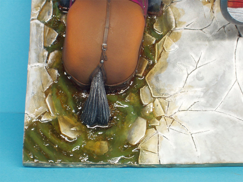 Фигурка лепилась из художественной пластики. Красил Тамией, оттенял акрилом Vallejo. Штрафник экипирован трофейным МР-40 (Dragon) с двумя запасными обоймами, запихнутыми под ремень, и трофейным Вальтером (также Dragon) под ремнем на спине. Подставка и грунт - алебастр. Растительность - засушеный гербарий. Колючка из обычной медной проволоки.
